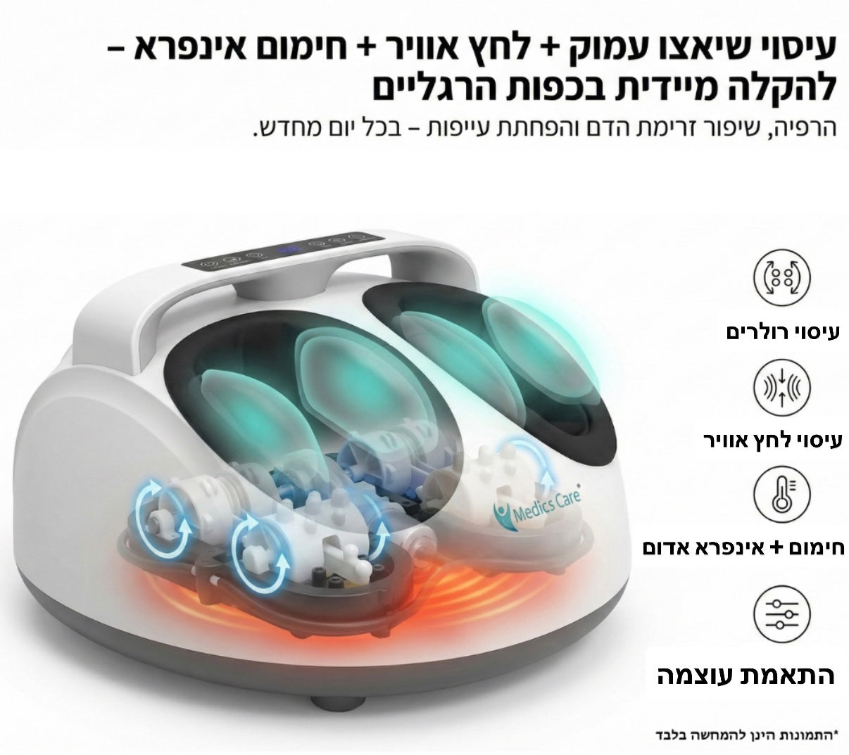 מכשיר העיסוי של Medics Care מעניק חוויית עיסוי מקיפה ומקצועית, המשלבת טכנולוגיות מתקדמות לטיפול בכפות הרגליים, ובקרסוליים.
